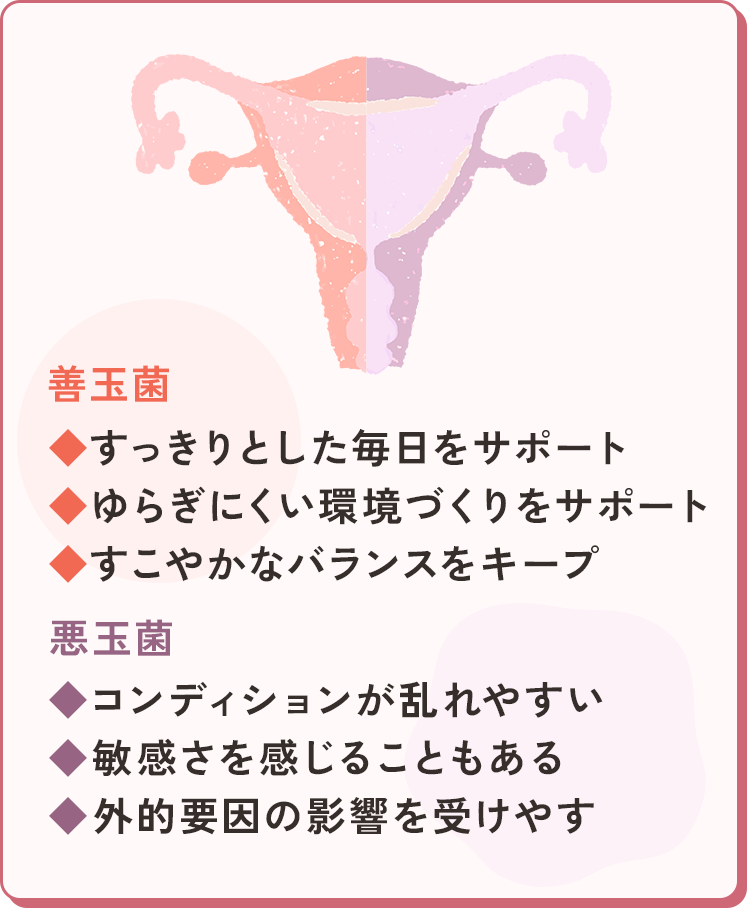 膣内では乳酸菌(善玉菌)をはじめとした多様な菌がバランスを保ちながら共生しています。